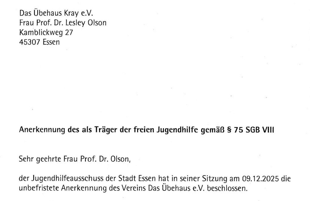 Das Übehaus Kray e.V. gibt Kindern Raum für musikalische Erfahrungen! Alleine oder in der Gemeinschaft, mit oder ohne Instrument, um dadurch ihre Selbstwirksamkeit, Beziehungsfähigkeit und musikalische Entwicklung zu stärken. Um einen Stadtteil mit Musik zu einem besseren Ort zu machen!